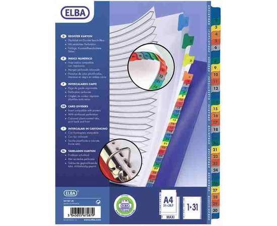Index carton alb Mylar numeric 1-31, margine PP color, A4 XL, 170g/mp, ELBA