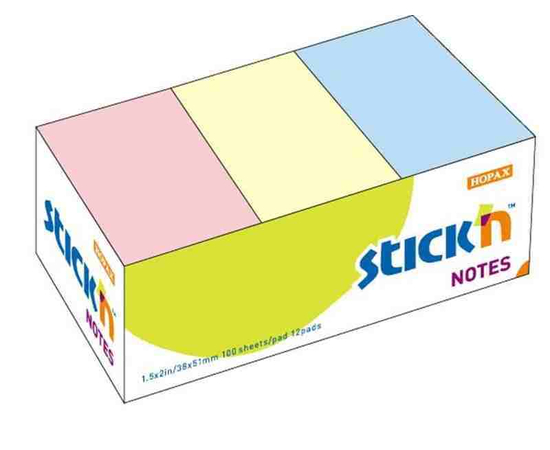 Notes autoadeziv 38 x 51 mm, 12 x 100 file/set, Stick"n - 3 culori pastel