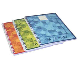 Caiet cu spirala metalica. Hartie alba fara clor de 70 gr/mp prevazuta cu microperforatii pentru desprinderea usoara a filelor si 4 perforatii pentru incopciere. Coperta fata din polipropilena, coperta spate din carton rigid.  Numar de file: 80.