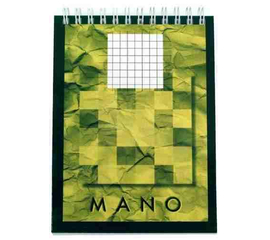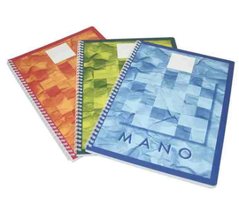 Caiet cu spirala metalica dubla . Hartie alba fara clor de 90 gr/mp. Coperta fata din carton color lucios, coperta spate din carton rigid.  Numar de file: 50.