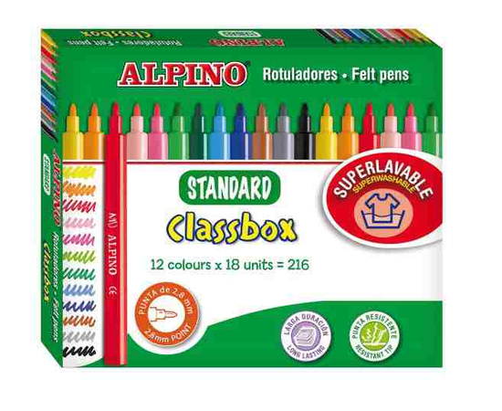 Carioca lavabila, 18 x 12 culori/cutie, ALPINO Standard Economy pack - ideale pt. scoli si gradinite