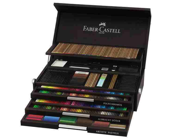 Un set de creioane colorate intr-o cutie eleganta din lemn (creioane colorate POLYCHROMOS, creioane pastel POLYCHROMOS, creioane ALBRECHT DÜRER, creioane CASTELL, creioane PITT MONOCHROME si accesorii).