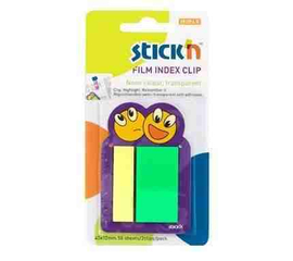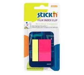Din plastic transparent, folosite pentru a evidentia textul. Adera la orice tip de suprafata, repozitionabile.  Culoare: galben/magenta neon. Ambalare: 30 ( 2 x 15 ) file / set.  Dimensiuni : 76 x 50 mm.