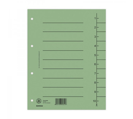 Realizate din carton preset, 250 gsm, obtinut prin reciclare. Index ce permite o ajustare rapida si usoara a distantierelor, in concordanta cu nevoile dumneavoastra. Index: 1-10. Perforatii: 4. Format: A4. Dimensiune separator: 235x300 mm. 100 bucati/ set. Culoare: verde....