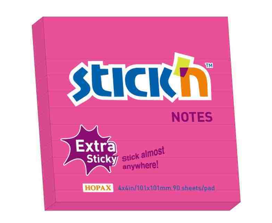 Notes autoadeziv extra-sticky liniate 101 x 101mm, 90 file, Stick"n - magenta neon
