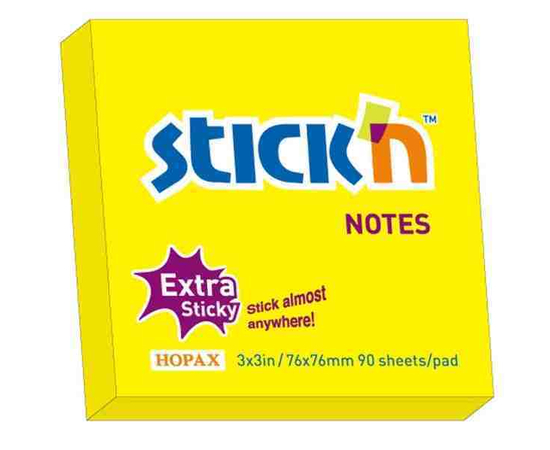 Notes autoadeziv extra-sticky 76 x 76mm, 90 file, Stick"n - galben neon