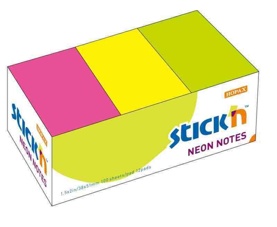 Notes autoadeziv 38 x 51 mm, 12 x 100 file/set, Stick"n - 3 culori neon