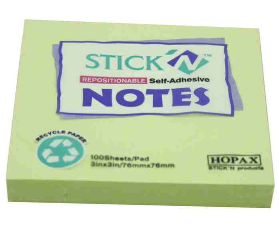 Notes autoadeziv 76 x 76 mm, 100 file, Stick"n - verde pastel - hartie reciclata