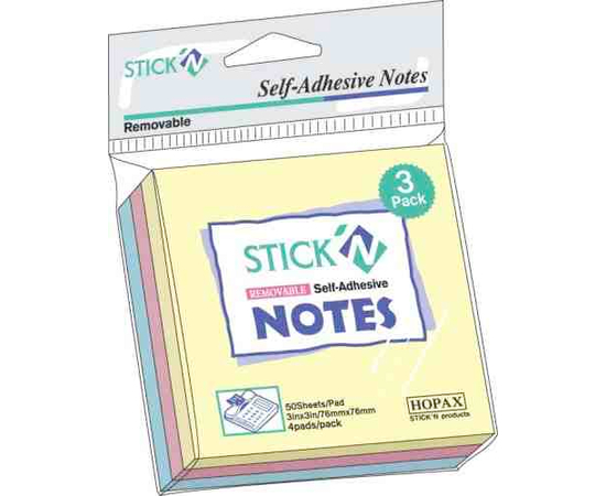Notes autoadeziv 76 x 76 mm, 3 x 50 file/set, Stick"n - 3 culori pastel