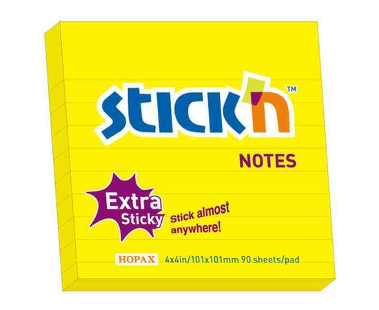 Notes autoadeziv extra-sticky liniate 101 x 101mm, 90 file, Stick"n - galben neon