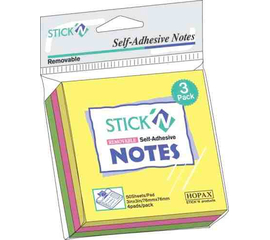 Notes autoadeziv 76 x 76 mm, 3 x 50 file/set, Stick"n - 3 culori fosforescente