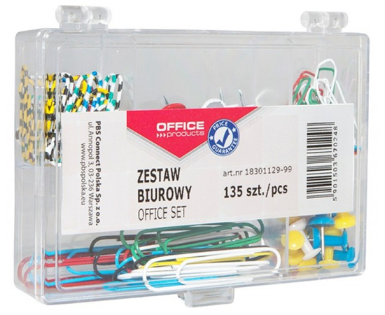 - Contine: pioneze panou pluta cu cap de plastic (15 buc), agrafe zebra 28 mm (20 buc), agrafe colorate 50 mm (20 buc), agrafe colorate 26 mm (30 buc), pioneze colorate (50 buc)