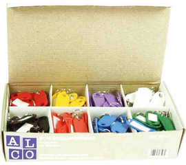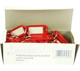 • Etichete pentru chei, confectionate din plastic flexibil, cu inel metalic. Culorile sunt asortate, iar cutiile sunt disponibile fie cu 50 de bucati, fie cu 200