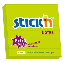 Notes autoadeziv extra-sticky liniate 101 x 101mm, 90 file, Stick"n - verde neon