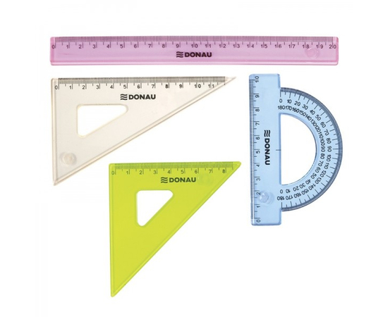 Set geometrie mic, contine: rigla 20cm, raportor, echer 10.5cm si echer 15cm, DONAU - culori asortate
