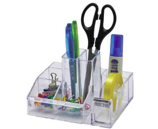 Suport plastic pentru accesorii de birou, 8 compartimente, 148 x 87mm, KEJEA - transparent